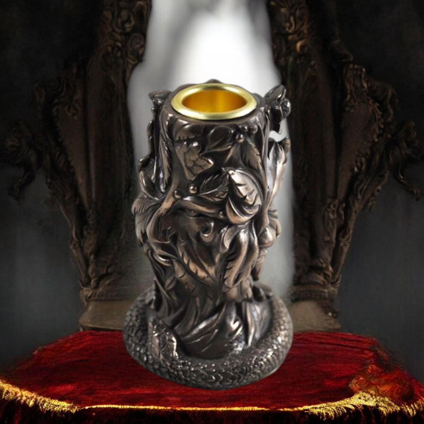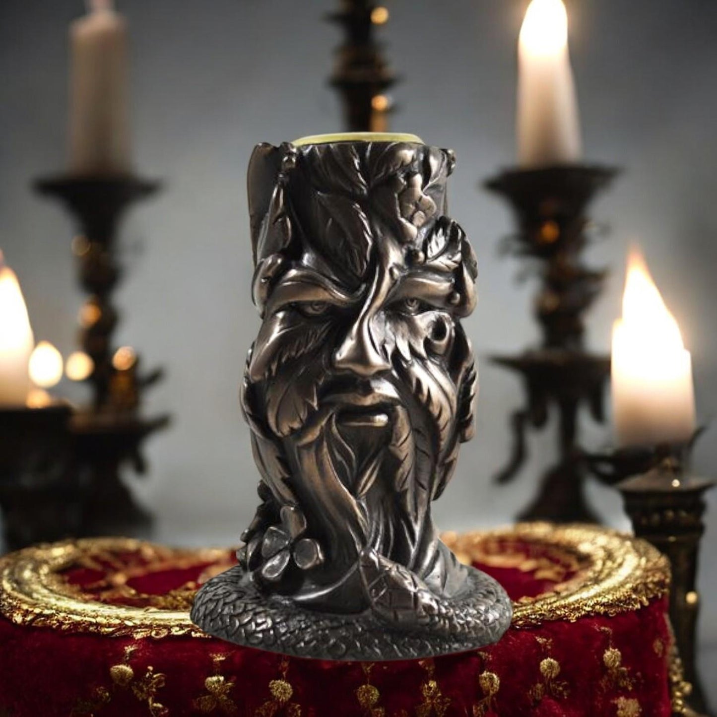Connect with the spirit of nature with this Wiccan Style Greenman Candle Holder, a stunning addition to any sacred space or home decor. Standing at 9.2 cm in height, this candle holder is crafted from durable cold cast resin and hand-painted with a bronze finish, giving it a timeless look. Representing the Greenman, an ancient symbol of growth, fertility, and rebirth, this piece is ideal for Wiccan and Pagan altars, or as a thoughtful gift for those who honor the natural world.