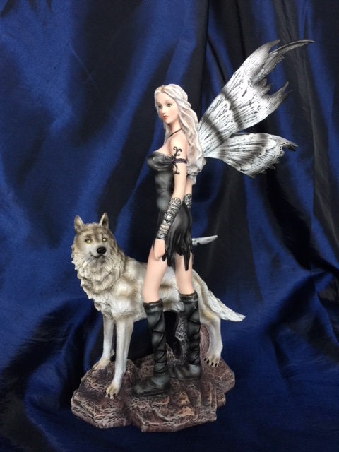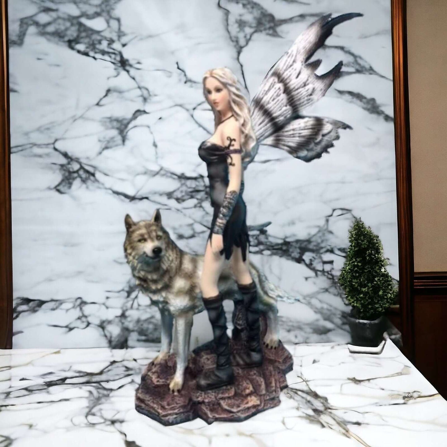 The piece is a testament to skilled craftsmanship, with each feather on the fairy's expansive wings and each strand of fur on the wolf's coat carved with precision. The fairy's delicate features and enigmatic expression invite you to ponder the untold stories of her mystical world, while the wolf's loyal gaze offers protection and companionship.