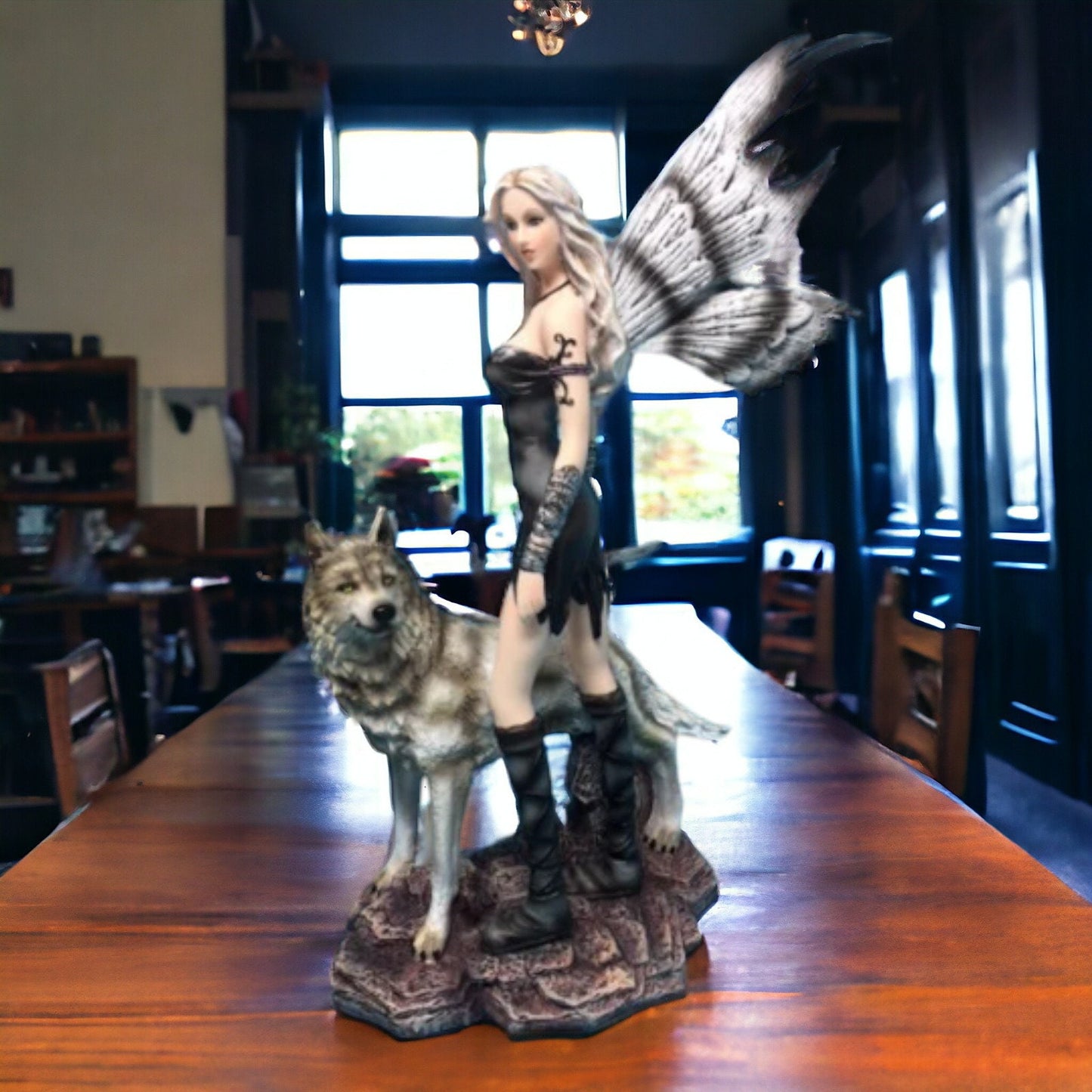 We invite you to embrace the magic and let your imagination take flight with this fairy and her wolf companion. Bring home the 'Winged Guardian' and let it transform your space with its mystical charm.