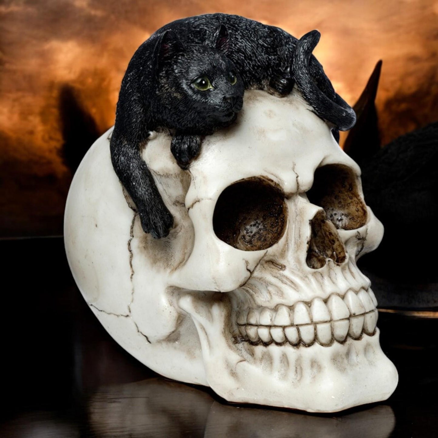 The black cat, a symbol of mystery and magic, lounges on an aged skull, evoking supernatural energy and dark fantasy themes. Whether you're a gothic collector, cat lover, or someone who enjoys unique home decor, this piece makes a perfect statement.